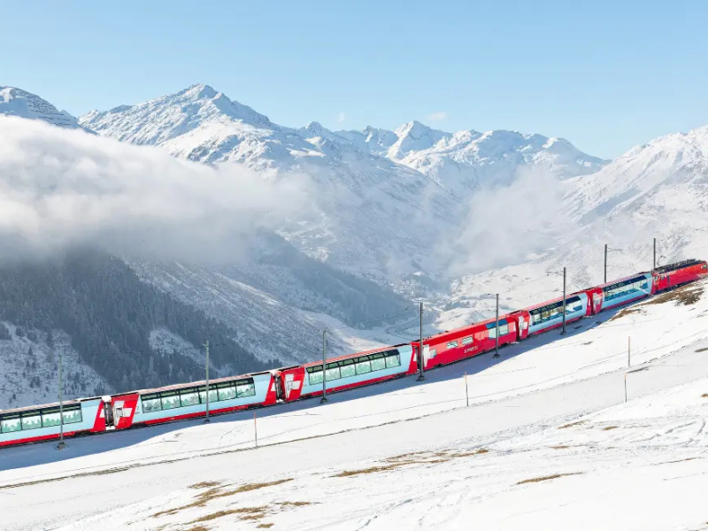 While not a cogwheel railway, the Glacier Express deserves a spot on any list of iconic mountain rail journeys. Running between Zermatt and St. Moritz, it’s famous for being the “world’s slowest express train.” Taking about eight hours, the route is packed with highlights: the Oberalp Pass at 2,000 meters, the Rhine Gorge often dubbed the “Swiss Grand Canyon,” and countless viaducts and tunnels.