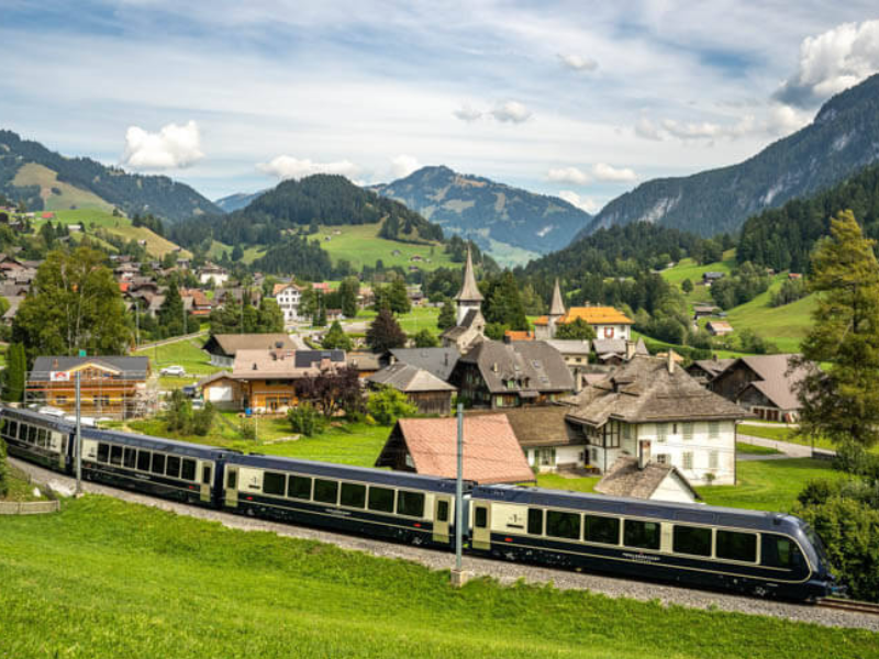 If you want a blend of Swiss landscapes, the GoldenPass Line delivers it all. Running from Lucerne to Montreux, it takes you through three language regions of Switzerland, rolling past lakes, vineyards, and mountains. One highlight is the section between Zweisimmen and Montreux, where the train descends dramatically towards Lake Geneva with vineyards on either side.