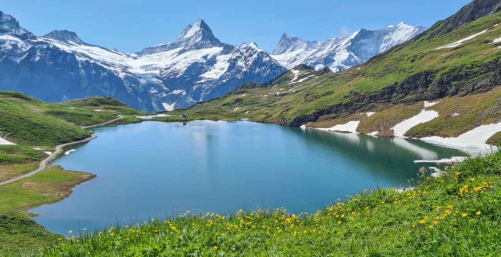 High above Grindelwald, Bachalpsee is often called the “mirror lake” because it reflects the surrounding peaks. Visitors reach it via the First cable car and a short hike. It’s not ideal for swimming due to cold alpine waters, but it’s famous for photos, picnics, and the nearby Tissot Cliff Walk.