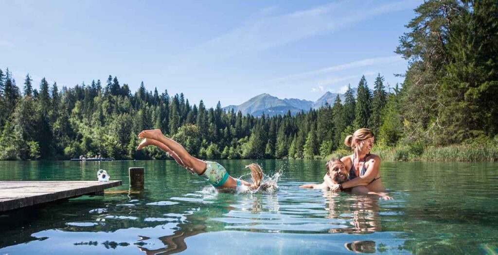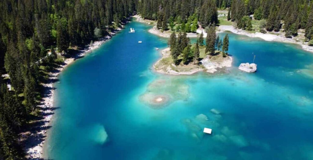 Near Flims, Caumasee is a family-friendly swimming lake with shallow turquoise waters. It’s great for picnics, paddleboarding, and sunbathing. Many visitors ask, “Which is the best swimming lake in Switzerland?” Caumasee is always a top answer because of its warm water and natural beauty.