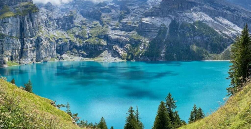 Located in the Bernese Oberland, Oeschinensee is a UNESCO site and one of Switzerland’s most beautiful alpine lakes. Visitors ride the Oeschinensee Gondola and hike down to the lake for swimming, rowing, or barbecues. Many ask, “Can you swim in Oeschinensee?” Yes, but the water is very cold perfect after a hike.