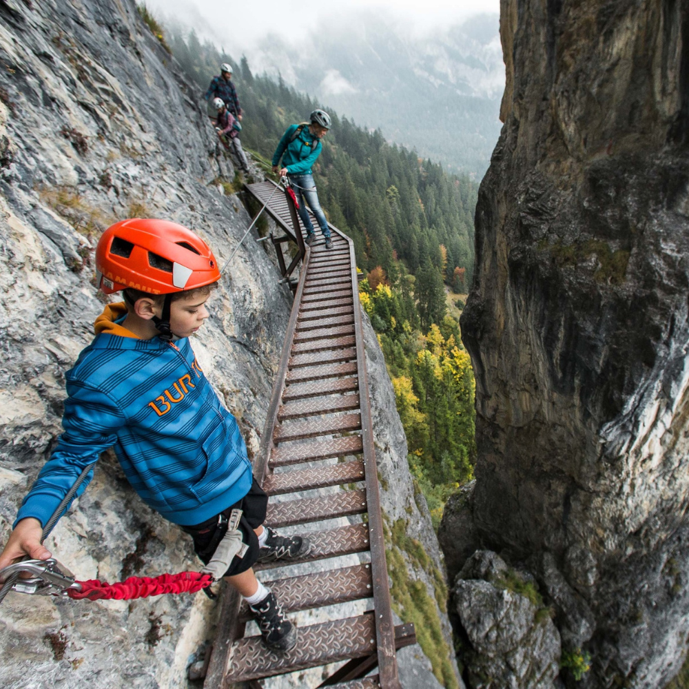 - Highlights: Switzerland’s oldest via ferrata, dating back to 1739. Mix of ladders, rock tunnels, and views over Flims.