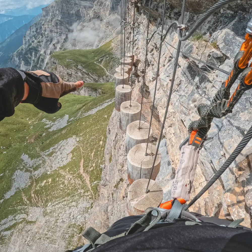 “Via ferrata” is Italian for “iron path.” It’s a climbing route that uses fixed steel cables, ladders, bridges, and rungs anchored into the rock. Climbers clip into the cable with special gear, making it safer than traditional rock climbing while still delivering an adrenaline rush.